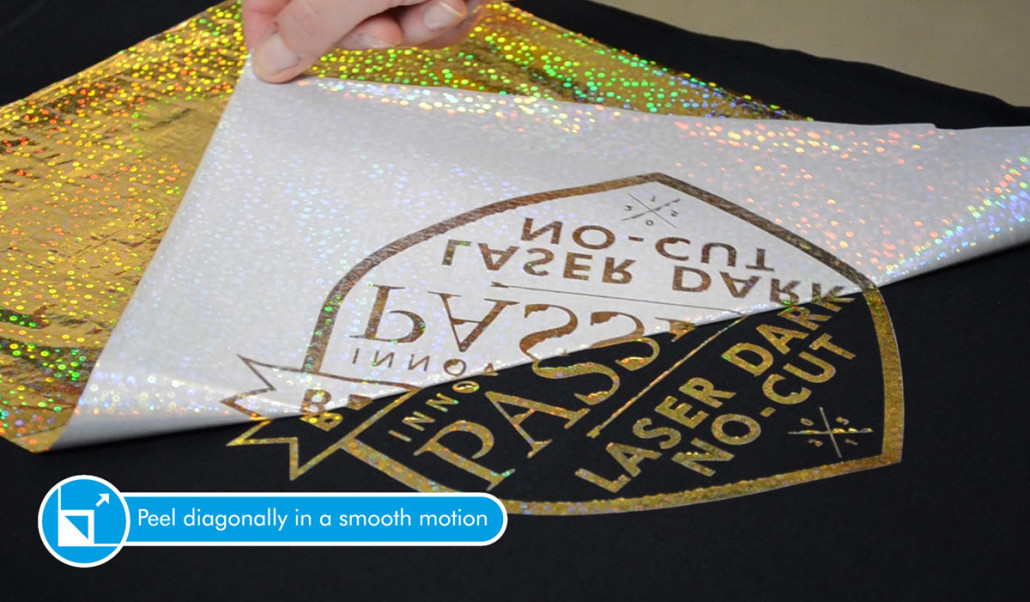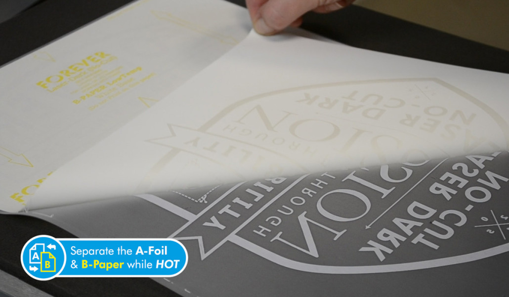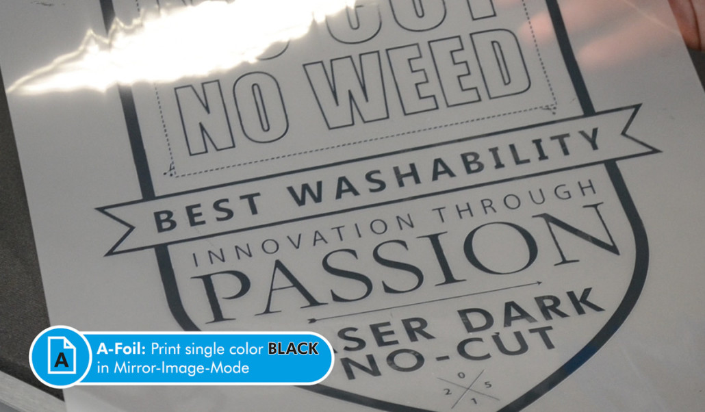 En el primer paso, se transfiere el diseño con tóner negro usando la hoja A-Foil. Este proceso es idéntico al de la aplicación normal con Laser-Dark (No-Cut) LowTemp, pero con un paso adicional. El acabado Metalizado se logra a través de la aplicación del Hot Stamping Foil.